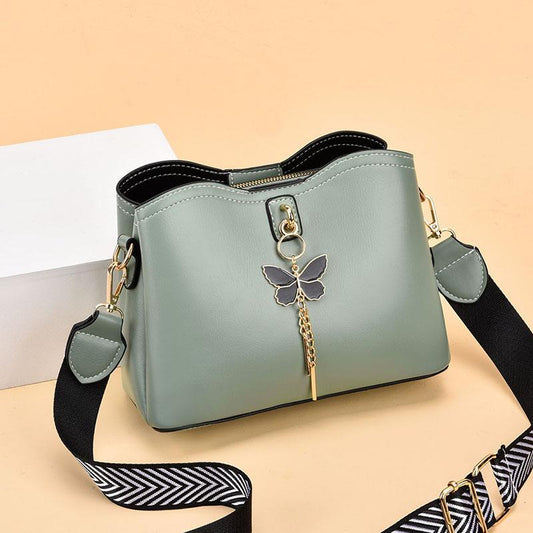 2024 Spring/Summer New Fashion Solid Color Shoulder Bag Versatile Casual Strap Bag Wide Shoulder Strap Simple and Elegant Bucket Bag Butterfly Decoration Women's Bag